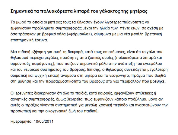 Όσο μεγαλύετρη χρονική περίοδο μια μητέρα θηλάζει το νεογέννητο παιδί της, τόσο μεγαλώνει ο εγκεφαλος του και τόσο αυτό αποκτά αυξημένες νοητικές δυνατότητες.