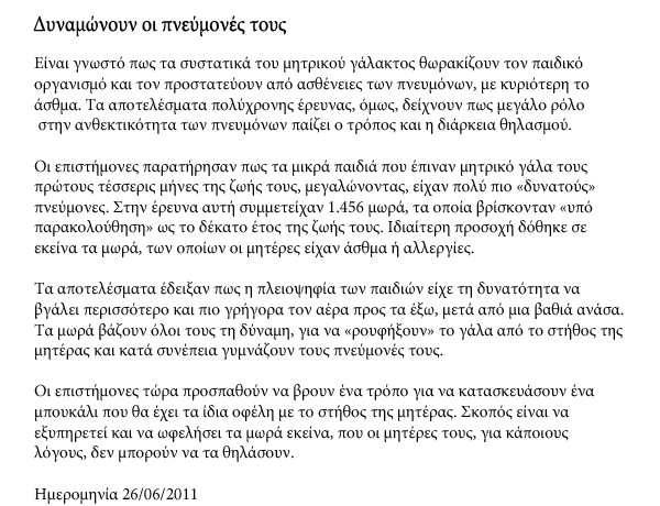 Είναι γνωστό πως τα συστατικά του μητρικού γάλακτος θωρακίζουν τον παιδικό οργανισμό και τον προστατεύουν απο ασθένεις των πνευμόνων, με κυριότερη το άσθμα. Τα αποτελέσματα πολύχρονης έρευνας, όμως, δείχνουν πως μεγάλο ρόλο στην ανθεκτικότητα των πνευμόνων παίζει ο τρόπος και η διάρκεια θηλασμού.